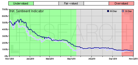 When an indicator hits a peak, insiders are the most optimistic. Back in late fall 2008, INK's market indicators hit an all-time peak suggesting that stocks were deeply undervalued and presented a significant buying opportunity. Share prices subsequently rallied strongly, with many small cap names doubling in value over the next year.